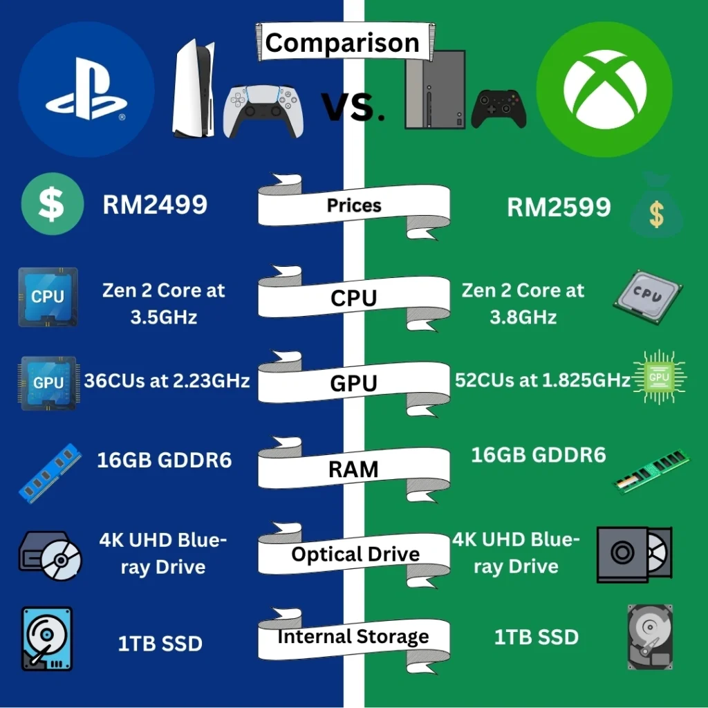 This infographic was created to visually compare PlayStation and Xbox using a clear, side-by-side format. The main objective was to help potential buyers quickly grasp the difference between the two consoles, and understand why one might be worth the higher price.